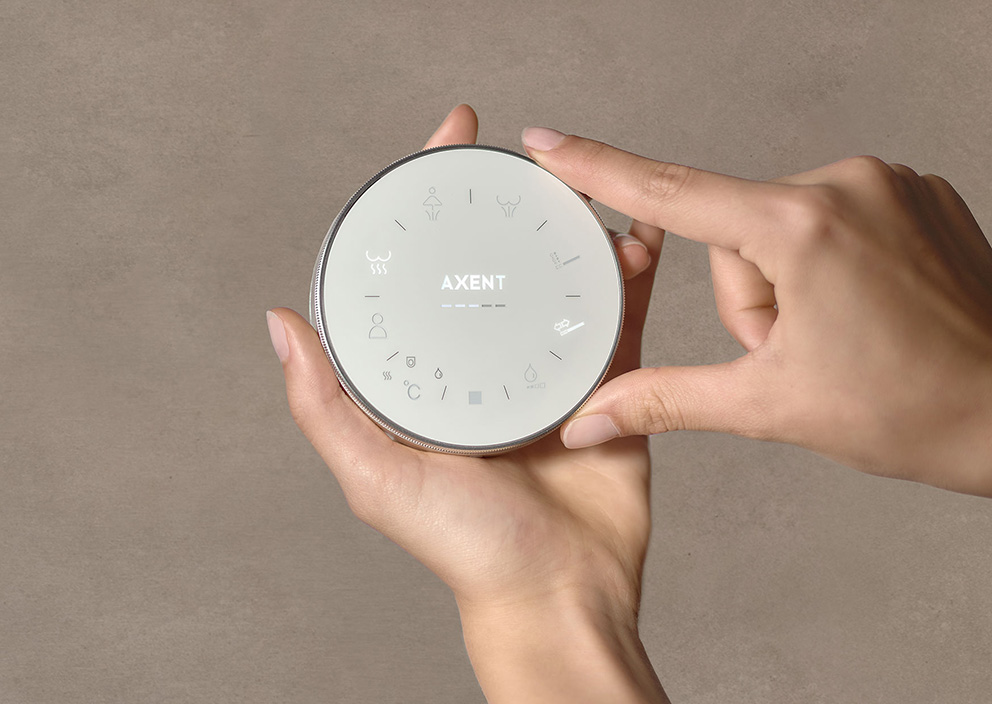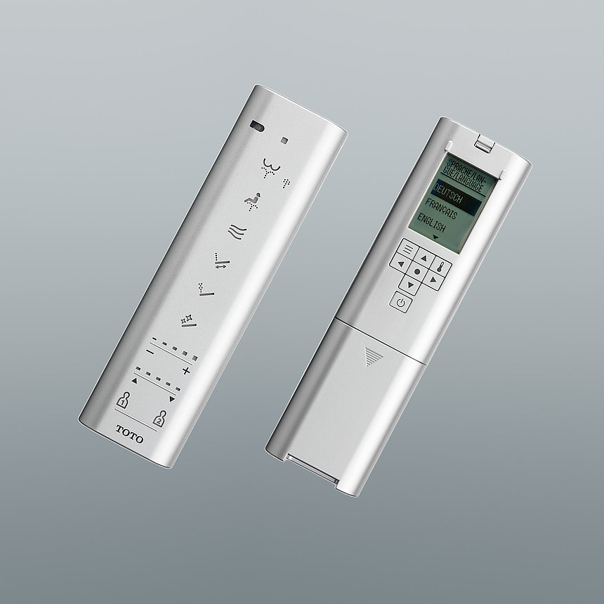- Bluetooth-Fernbedienung mit einer verchromten Gehäuseumrandung und geschlossener Bedienfläche für mehr Hygiene