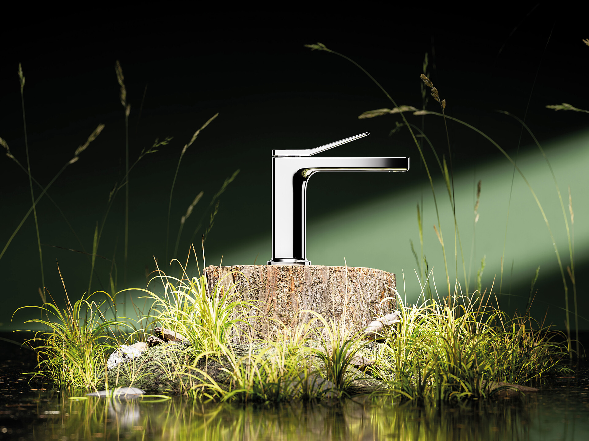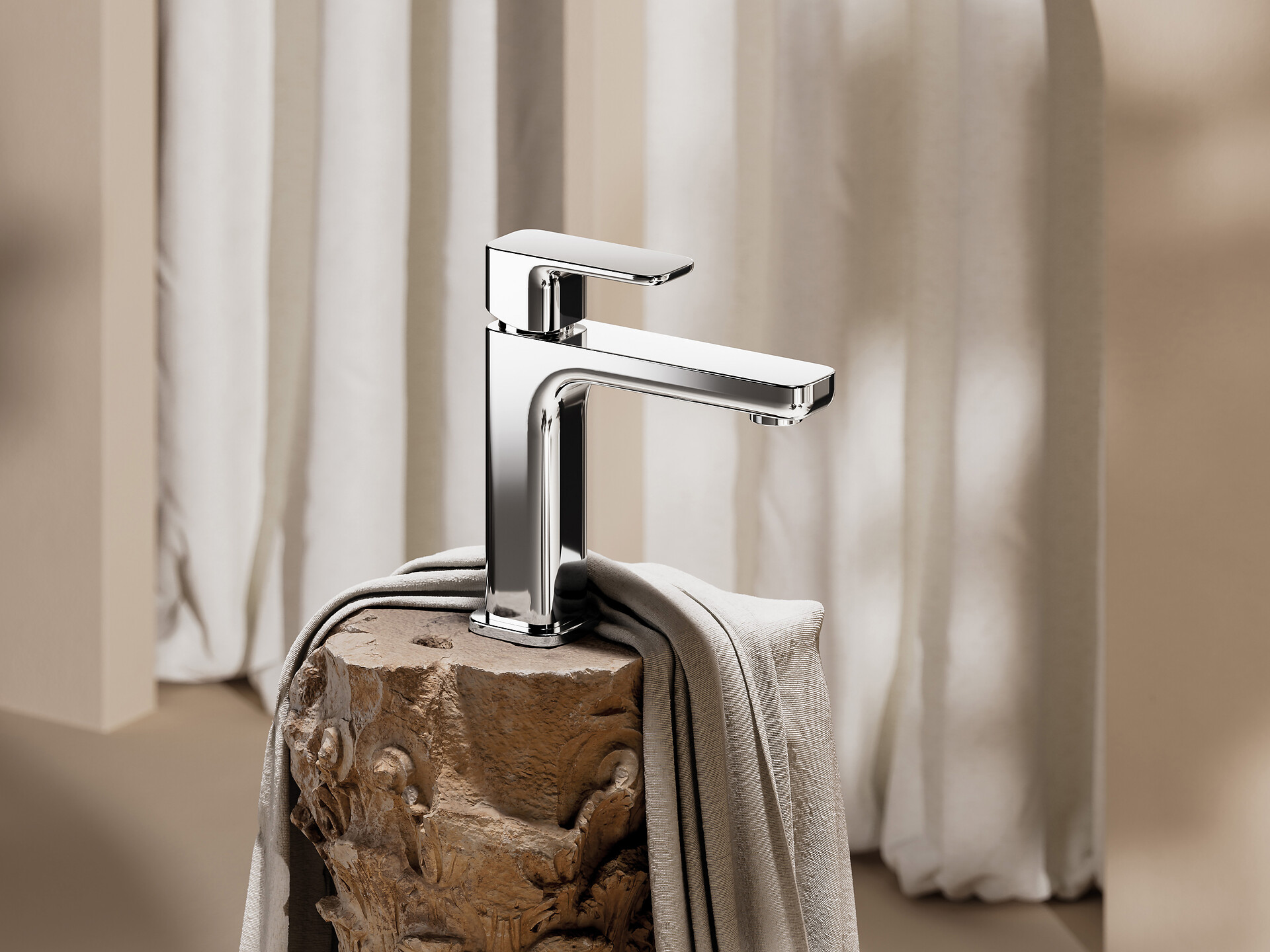 Eine markante und exakte Geradlinigkeit kennzeichnet den Kludi-Decus Einhand-Waschtischmischer. Dabei überzeugt die Formensprache durch das harmonische Zusammenspiel präziser Kanten und weicher Linien. Der wohltuend unaufgeregten Erscheinung verleiht der ultraflache, nach oben abgewinkelte Hebel eine spannende Dynamik, die der eleganten Ästhetik einen modernen, frischen Touch verleiht.